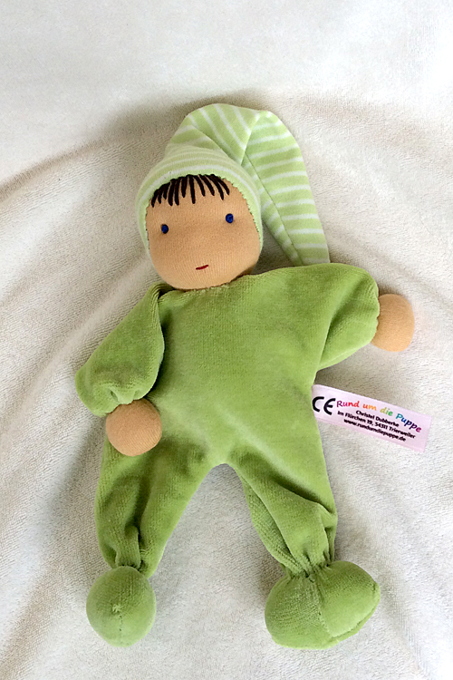 Die Mini- Nickipüppchen sind entsprechend den Spielbedürnissen von Babys bewußt sehr einfach gehalten. Gefüllt mit Bio Schafwolle ist nur der *innere Kern* des Rumpfes, der innen im Nicki-Körper fest eingenäht ist. Demzufolge kann ein Baby auch dann nicht mit dem Füllmaterial in Kontakt kommen, wenn einmal der Nickistoff des Körpers beschädigt sein sollte. Ebenso ist die Wäsche im Handwaschbecken kein Problem. Hier findest du eine genaue Wasch- und Pflegenanleitung.