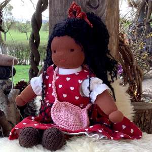 Die Puppe ist ausschließlich aus Bio Material angefertig. Demzufolge besteht die  Füllung aus reiner kardierter Bio – Schaf Wolle. Der Puppentrikot und alle Stoffe oder Wollen aus denen die Kleidung gearbeitet sind, sind ebenfalls aus hochwertigem Bio- Material hergestellt. Dazu erfährst du mehr auf der Informationsseite zu meinen Puppen.