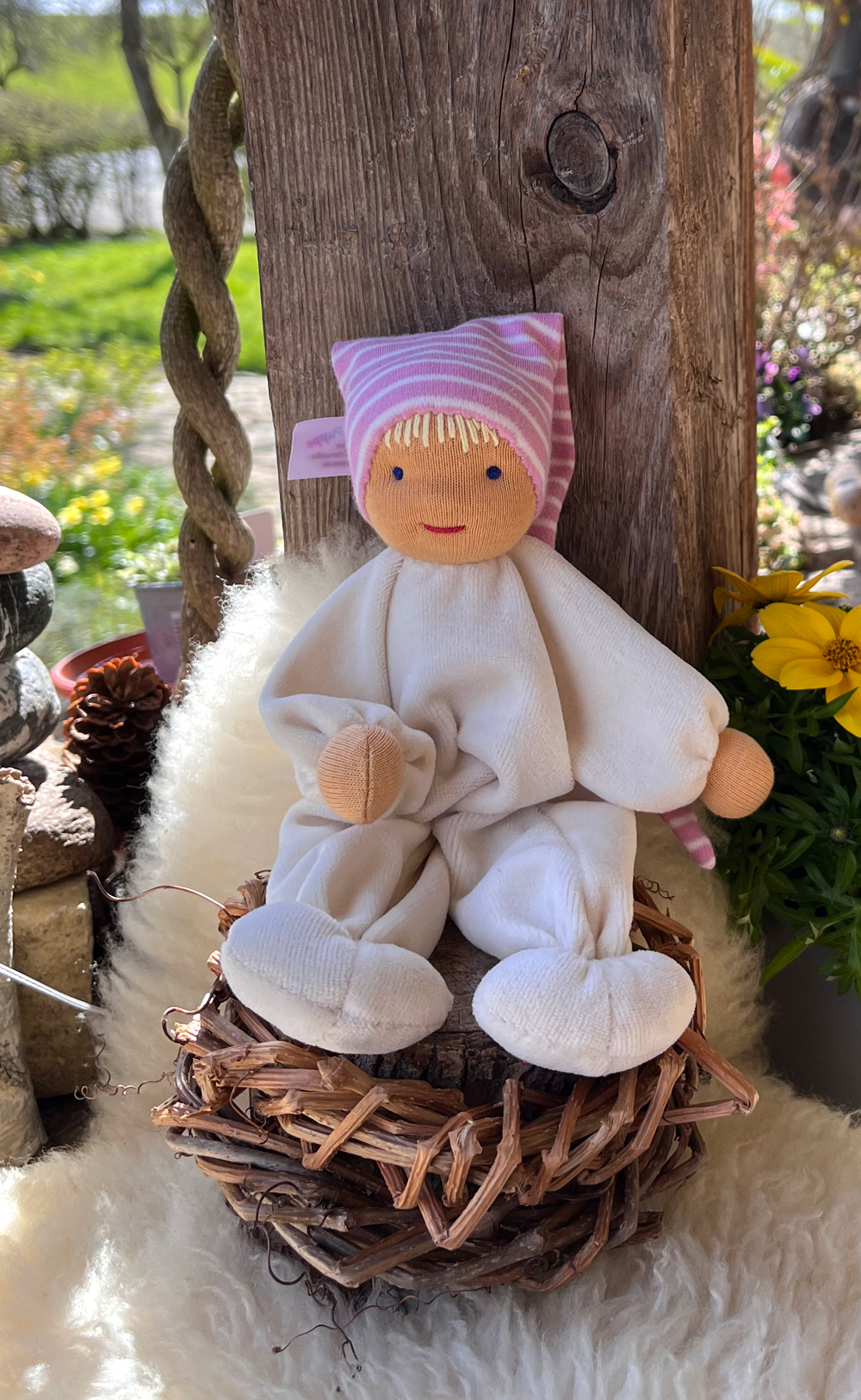 Diese Püppchen sind auch für Neugborene geeignet. Durch die besonderen Anfertigungsweise, bei der Arme und Beine nicht befüllt werden, sind sie sehr weich und kuschelig. Größe: ca 20cm (ohne die Zipfelmütze)